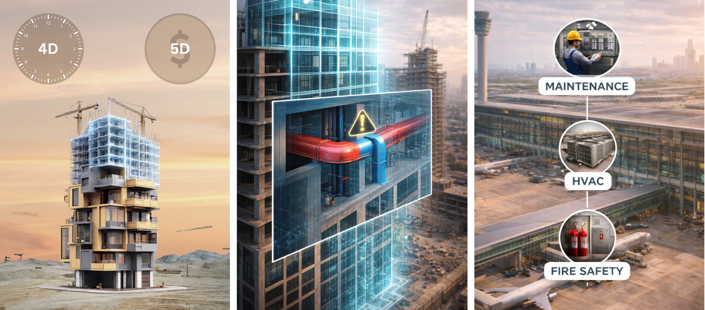 4D BIM adds time, helping planners simulate construction sequences.